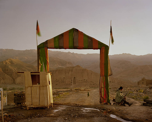 [Image: Simon Norfolk. “Victory arch built by the Northern Alliance at the entrance to a local commander’s HQ in Bamiyan. The empty niche housed the smaller of the two Buddhas, destroyed by the Taliban in 2001.” From Afghanistan: Chronotopia.]