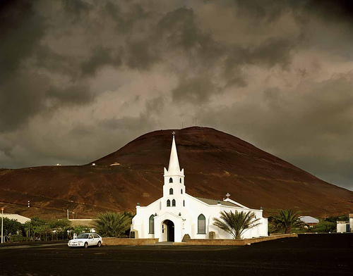 [Image: Simon Norfolk. Ascension Island, South Atlantic. “The Church Of St Mary in Georgetown with Cross Hill in the background with an American radar facility on its summit.”]