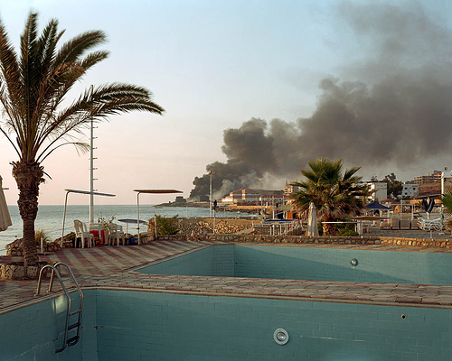 [Image: Simon Norfolk. “Storage depot for the oil-fired power station at Jiyé/Jiyeh bombed in the first few days of the [Israel-Hezbollah] war and still on fire and still dumping oil into the sea 20 days later. Seen from the Sands Rock Resort, 1 Aug 2006.”]