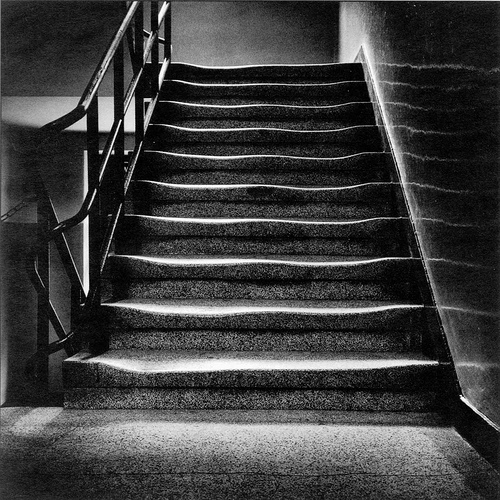[Image: Simon Norfolk. Staircase at Auschwitz, with worn footsteps.]