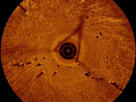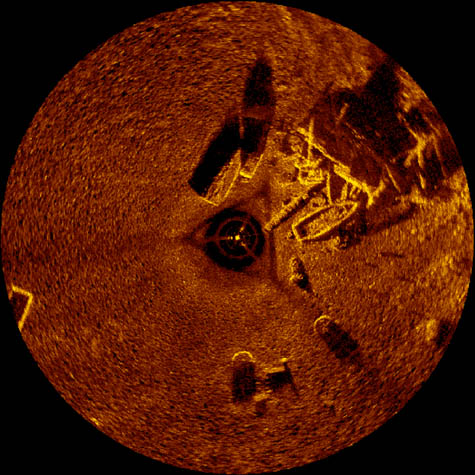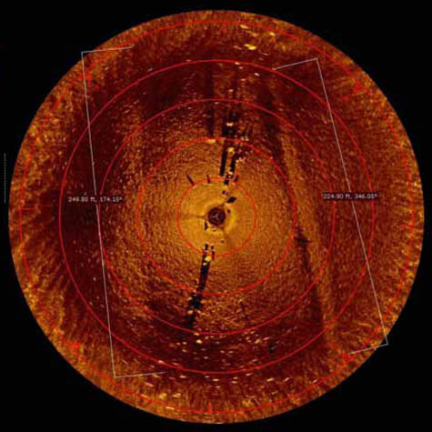 In a PDF assembled by Holley and Brian Abbott to document the expedition, we learn that the archaeologists had been hired to survey a series of old boatwrecks using a slightly repurposed “sector scan sonar” device. You can read about the actual equipment – a Kongsberg-Mesotech MS 1000 – here.