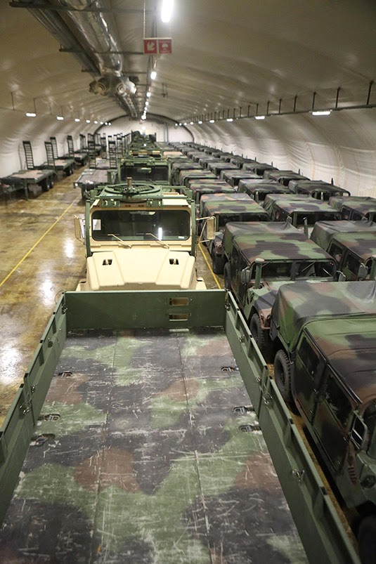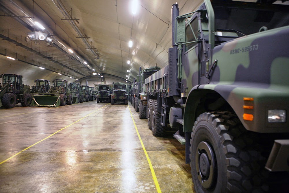 [Image: “Medium Tactical Vehicle Replacements, High Mobility Multipurpose Wheeled Vehicles and trailers, which belong to Marine Corps Prepositioning Program-Norway are staged in a storage cave at Tromsdal, Norway, Feb. 24, 2014. Marine Corps began storing equipment in several cave sites throughout Norway in the 1980s to counter the Soviets, but the gear is now reserved for any time of crisis or war.” U.S. Marine Corps photo by Lance Cpl. Sullivan Laramie].