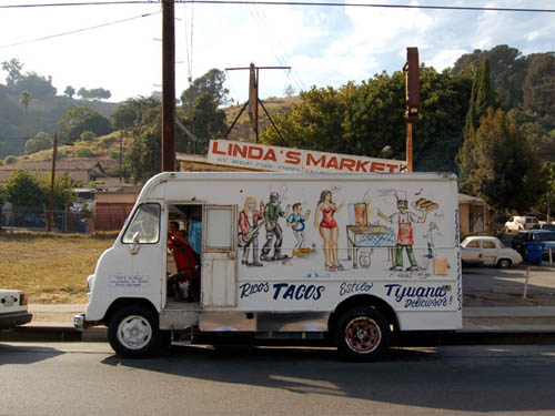 [Image: “There are two basic types of taco trucks,” we read; “the first and most common is the transient truck which is a truck that stops at approximately 20 different locations at 20-minute intervals during an 8-hour shift, typically beginning at 6am and ending at 2pm. The second type is the semi-permanent truck, which is a truck that has found a location that has a density of clientele to sustain it for an extended period of the day, creating a nearly fixed presence in a particular community.” From Polar Inertia].