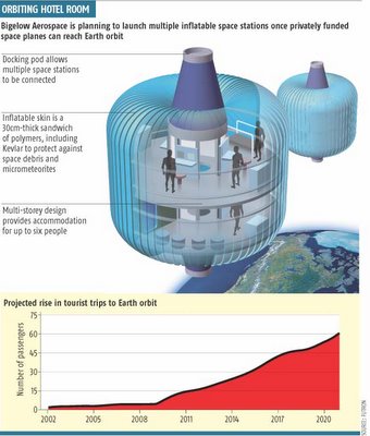 [Image: The “inflatable multilayered polymer hull” of this orbiting hotel room “will be around 30 centimetres thick and will contain layers of Kevlar – as used in bullet-proof vests – to provide some protection against micrometeorites and space debris” – as well as from rowdy hotel guests. Click on to enlarge; from New Scientist].