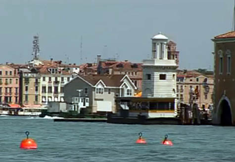 [Image: Mike Bouchet’s Watershed being towed through Venice towards the Arsenale basin, against a backdrop of Italian palazzi].