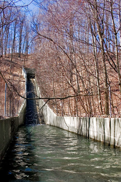 The only serious situation I’ve ever been in, with a high potential for injury – and I was pretty lucky – was while exploring in Niagara. The surge spillways for the Ontario Generating Station used to carry overflow water from the surge tanks, and those were fed by the intake pipes. So the water would overflow from the intake pipes into the surge tanks, and then drain out through these helical spillways that spiral downwards to the bottom of the gorge. They then outfall in front of the plant into the river.