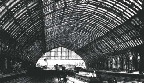 [Image: The interior iron arches of London’s St. Pancras Station, via