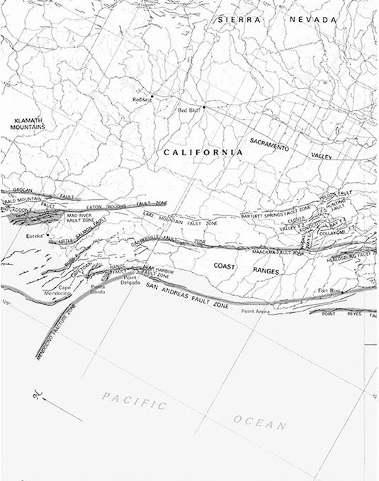 [Image: A map in four sections (see below three images) shows the San Andreas Fault stretching from northern to southern California. The San Andreas “is just one of several faults that make up a complex of potential catastrophes,” paleontologist Richard Fortey writes in Earth: An Intimate History. It is “the flagship of a fleet of faults that run close to the western edge of North America… In places, maps of the interweaving faults look more like a braided mesh than the single, deep cut of our imagination.” Here, we see the San Andreas come to an end in Northern California at the so-called Mendocino Triple Junction. Maps courtesy of the U.S. Geological Survey, from The San Andreas Fault System, U.S.G.S. Professional Paper 1515 (PDF); see original paper for higher resolution].