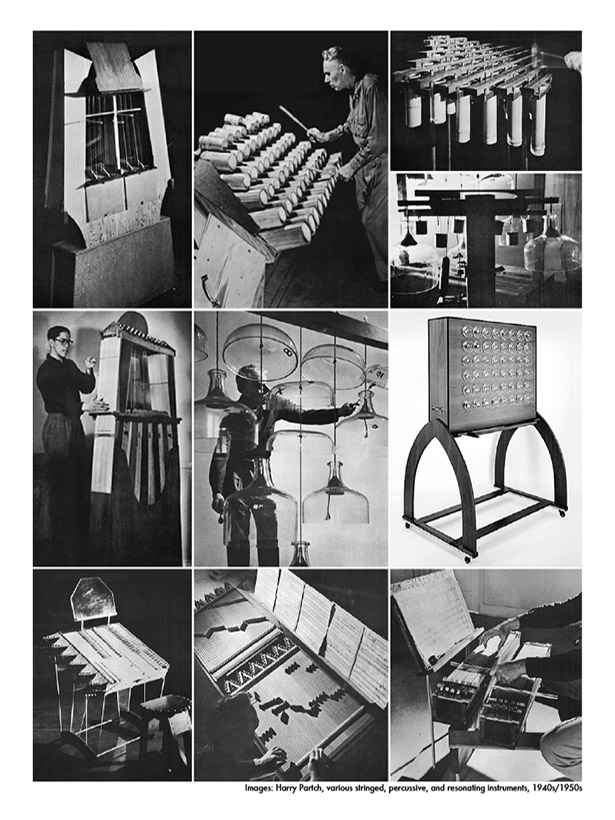 [Images: Harry Partch, various stringed, percussive, and resonating instruments (1940s/1950s)].