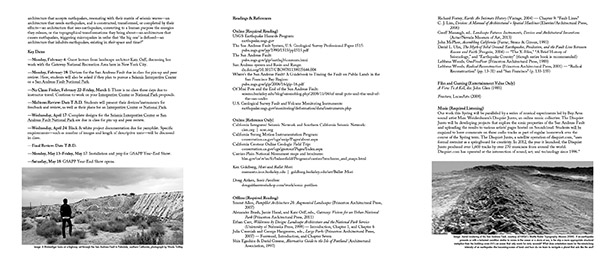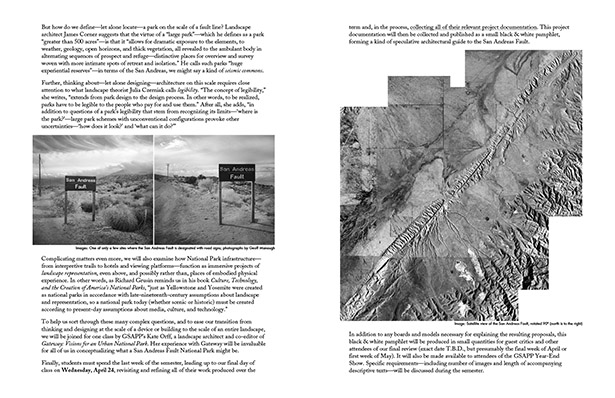 Finally, students must spend the last week of the semester, leading up to our final day of class on Wednesday, April 24, revisiting and refining all of their work produced over the term and, in the process, collecting all of their relevant project documentation. This project documentation will then be collected and published as a small black & white pamphlet, forming a kind of speculative architectural guide to the San Andreas Fault.
