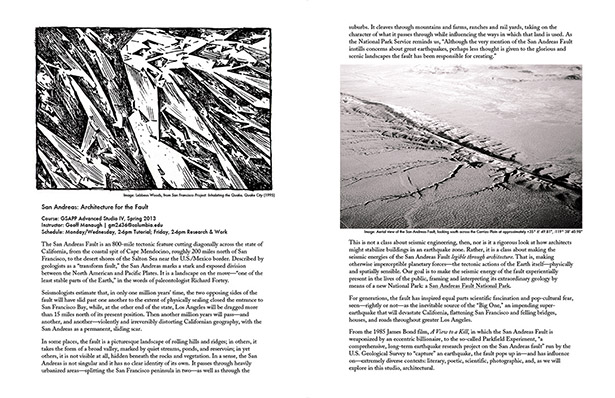 I thought I’d upload the course description for a studio I’ll be teaching this spring—starting next week, in fact—at Columbia University’s GSAPP on the architectural implications of seismic energy and the possibility of a San Andreas Fault National Park in California. The images in this post are just pages from the syllabus.
