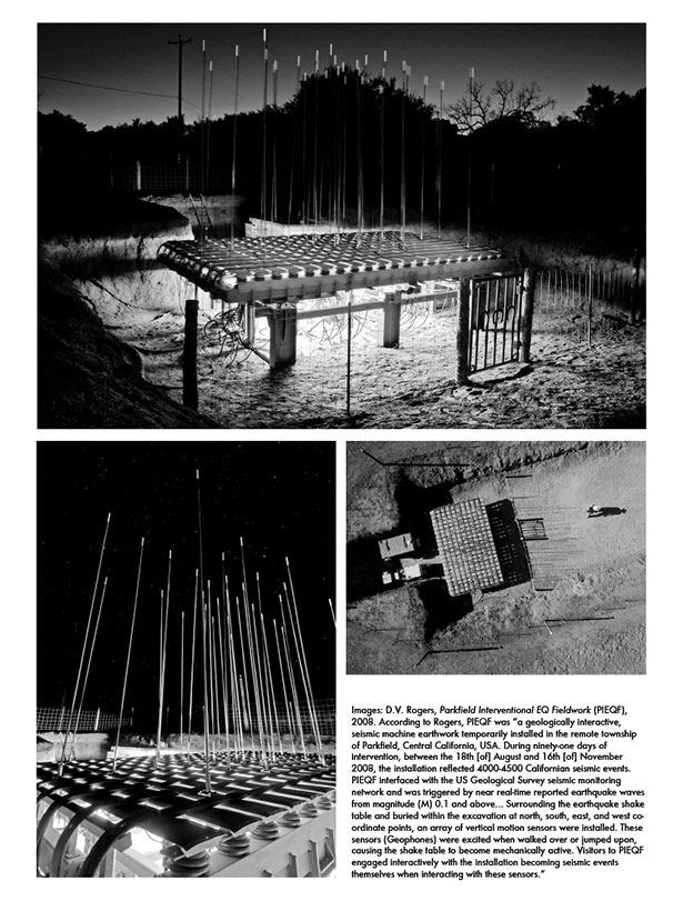 [Images: D.V. Rogers, Parkfield Interventional EQ Fieldwork (PIEQF), 2008. According to Rogers, PIEQF was “a geologically interactive, seismic machine earthwork temporarily installed in the remote township of Parkfield, Central California, USA. During ninety-one days of intervention, between the 18th [of] August and 16th [of] November 2008, the installation reflected 4000-4500 Californian seismic events. PIEQF interfaced with the US Geological Survey seismic monitoring network and was triggered by near real-time reported earthquake waves from magnitude (M) 0.1 and above… Surrounding the earthquake shake table and buried within the excavation at north, south, east, and west co-ordinate points, an array of vertical motion sensors were installed. These sensors (Geophones) were excited when walked over or jumped upon, causing the shake table to become mechanically active. Visitors to PIEQF engaged interactively with the installation becoming seismic events themselves when interacting with these sensors.”].