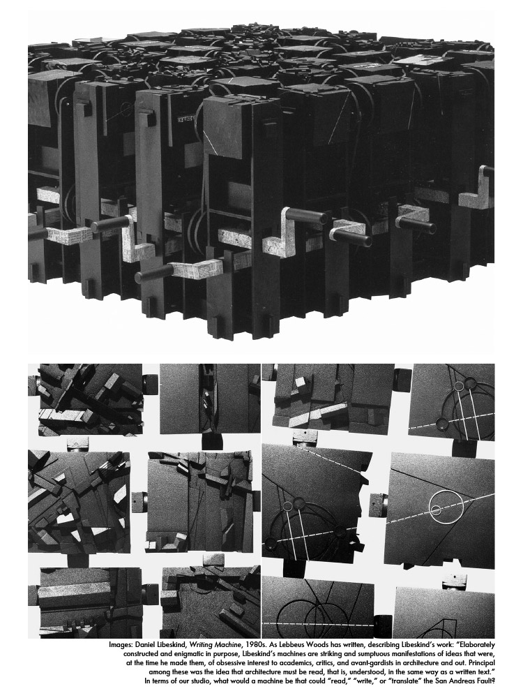 [Images: Daniel Libeskind, Writing Machine (1980s). As Lebbeus Woods has written, describing Libeskind’s work: “Elaborately constructed and enigmatic in purpose, Libeskind’s machines are striking and sumptuous manifestations of ideas that were, at the time he made them, of obsessive interest to academics, critics, and avant-gardists in architecture and out. Principal among these was the idea that architecture must be read, that is, understood, in the same way as a written text.” In terms of our studio, what would a machine be that could “read,” “write,” or “translate” the San Andreas Fault?].