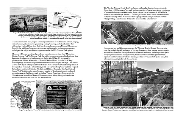 This means students must propose a working combination of such features as trails, lodging, visitors’ centers, educational programming, parking/camping, and other facilities that differentiate National Parks from their less developed counterparts, National Monuments, but with the addition of new types of structures and innovative landscape management techniques that might reveal future opportunities for the U.S. National Park system.