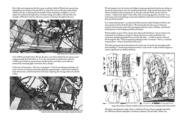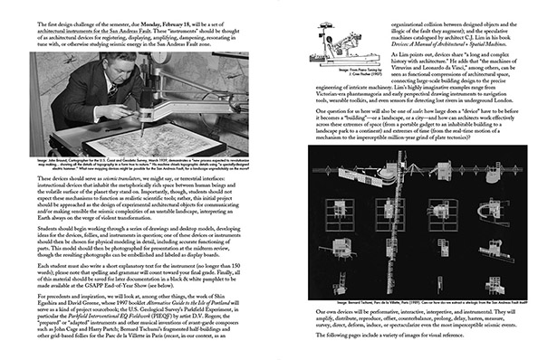 These devices should serve as seismic translators, we might say, or terrestrial interfaces: instructional devices that inhabit the metaphorically rich space between human beings and the volatile surface of the planet they stand on. Importantly, though, students should not expect these mechanisms to function as realistic scientific tools; rather, this initial project should be approached as the design of experimental architectural objects for communicating and/or making sensible the seismic complexities of an unstable landscape, interpreting an Earth always on the verge of violent transformation.