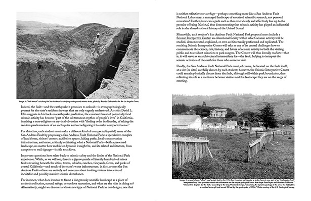 For instance, what does it mean to frame a dangerously unstable landscape as a place of aesthetic reflection, natural refuge, or outdoor recreation, and what are the risks in doing so? Alternatively, might we discover a whole new type of National Park in our designs, one that is neither reflective nor a refuge—perhaps something more like a San Andreas Fault National Laboratory, a managed landscape of sustained scientific research, not personal recreation? Further, how can a park such as this most clearly and effectively live up to the promise of being National, thus demonstrating that seismic activity has played an influential role in the shared national history of the United States?