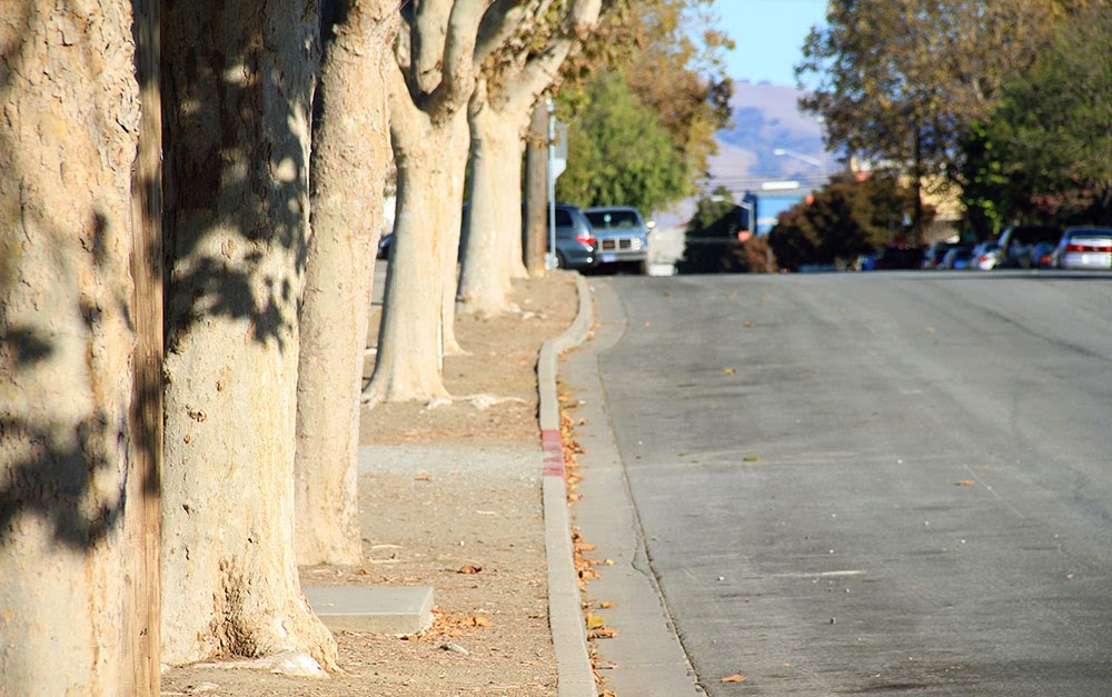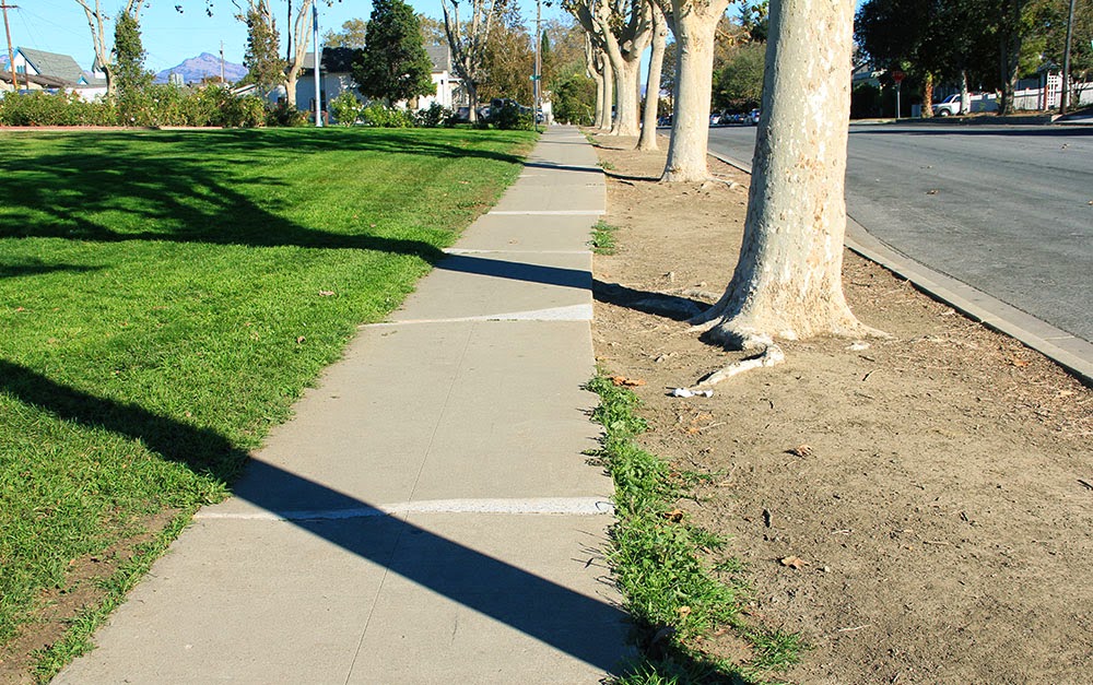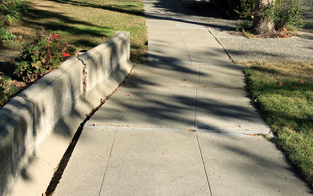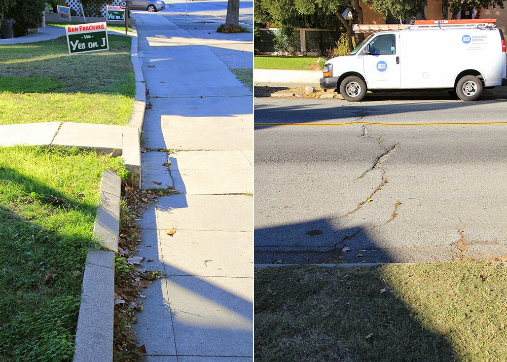 Curbs at nearly the exact same spot on opposite sides of the street are popped out of alignment. Houses too young to show this level of wear stand oddly warped, torqued out of synch with their own foundations, their once strong frames off-kilter. The double yellow lines guiding traffic down a busy street suddenly bulge northward—as if the printing crew came to work drunk that day—before snapping back to their proper place a few feet later.